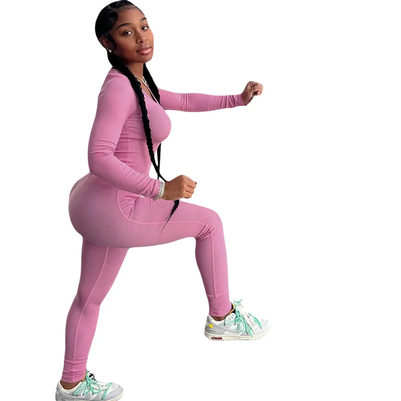 2pcs Solid Color Yoga Workout Set Long Sleeve Round Neck Top & High Stretch Running Sports Leggings Suit Women’s Activewear